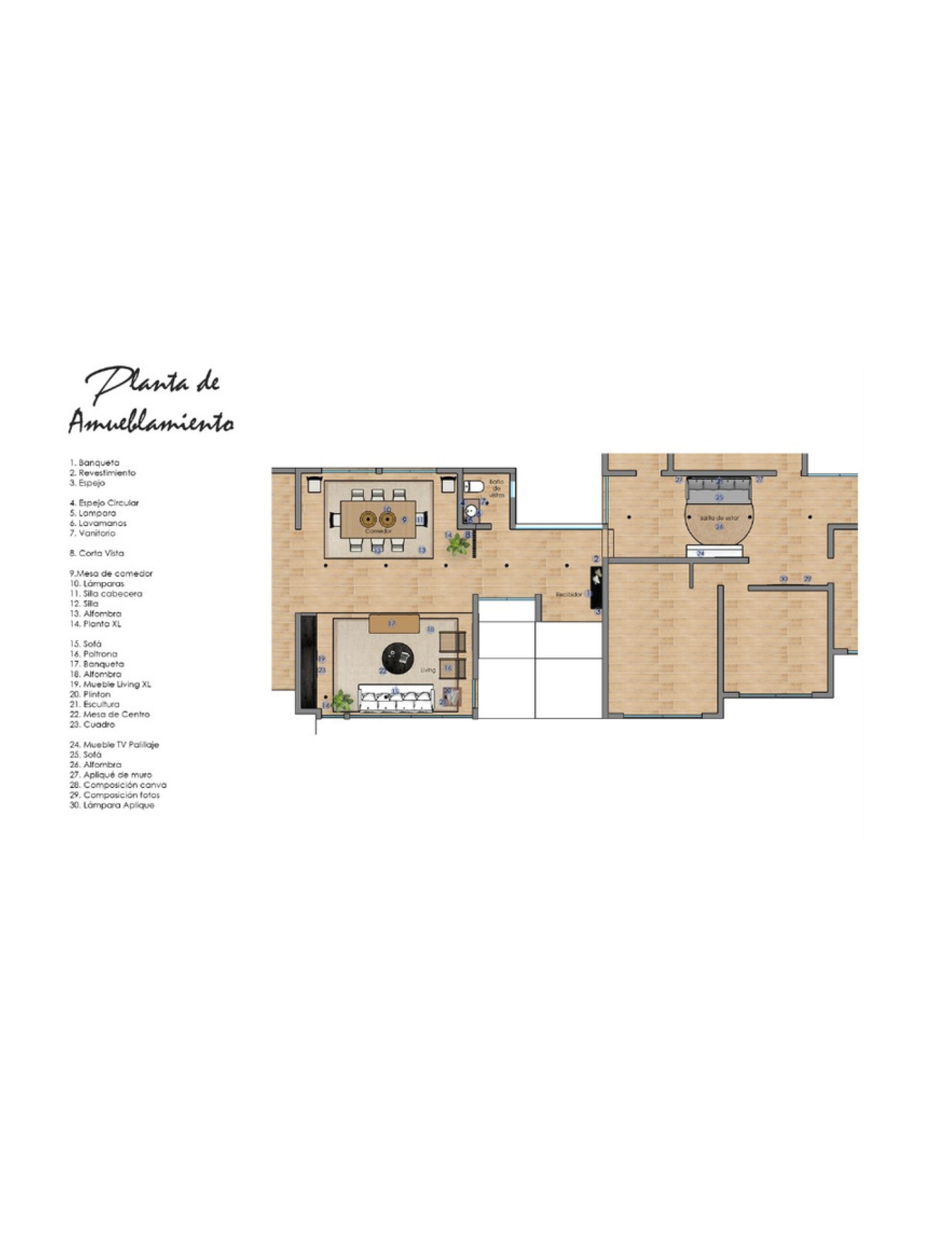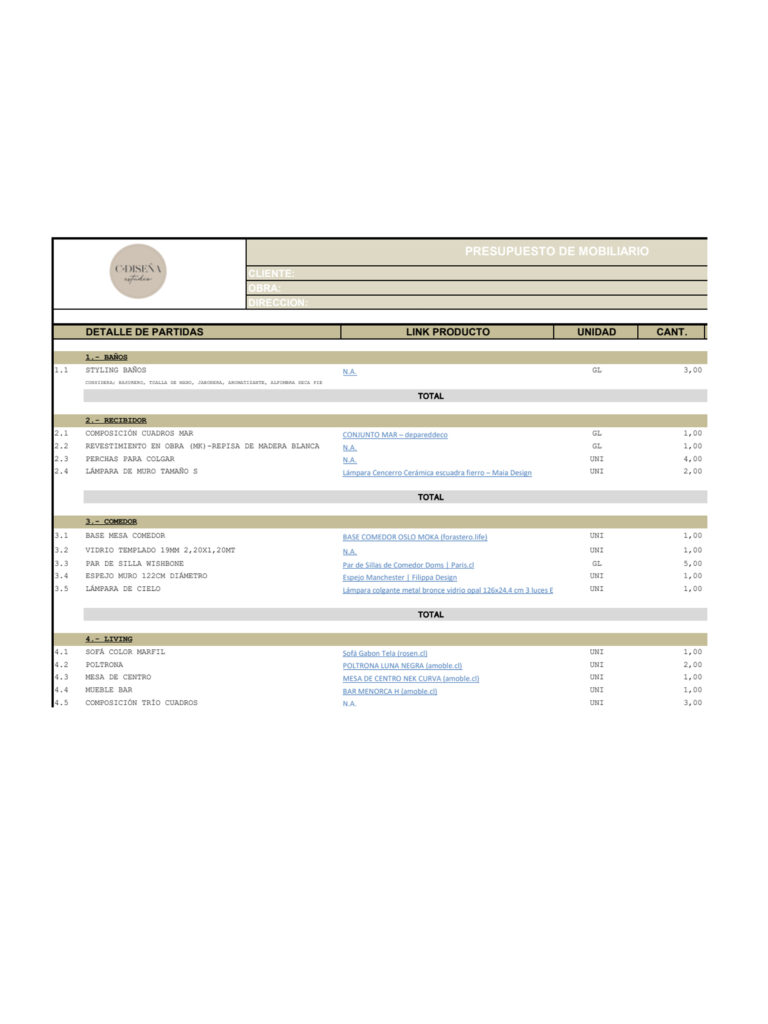Este servicio contempla el desarrollo del proyecto de diseño para la decoración de interiores. Entregamos herramientas concretas para que sea el cliente quien ejecute el proyecto. Para su implementación, disponemos de un moodboard de diseño con los elementos de cada espacio, listado del mobiliario seleccionado con los links de compra correspondientes y por último un plano esquemático para ver la ubicación de cada elemento.